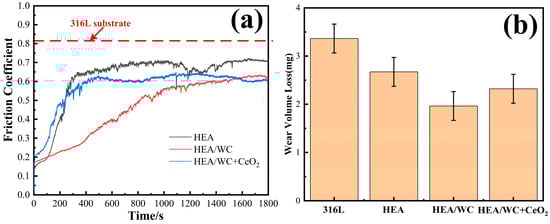 The tests showed that under the same load, the average friction coefficients of 316L substrate, HEA, HEA/WC, and HEA/WC + CeO2 coating were 0.82, 0.61, 0.29, and 0.43, respectively. The wear amounts of the samples were 3.364 mg, 2.642 mg (26.52% less than that of the substrate), 1.564 mg (53.51% less than that of the substrate), and 2.225 mg (33.86% less than that of the substrate), respectively.