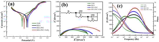 Figure 11b shows that adding CeO2 can significantly increase the capacitance arc diameter of the coating, indicating that charge transfer is more difficult at the interface between the electrolyte and electrode, and the pitting resistance is superior, which is consistent with the potentiodynamic polarization curve results []. Figure 11c shows the relationship among the frequency, impedance modulus, and phase angle of the four samples. As can be seen from the plot, in the 3.5% NaCl solution, the impedance modulus (|Z|) of all four materials in the high-frequency region (104–105 Hz) was about 5 Ω · cm2, and in the low-frequency region (10−2–10−1 Hz), the impedance modulus of the HEA/WC + CeO2 coating was 1.25 and 1.48 times higher than that of the HEA/WC coating and the substrate, respectively, which indicates that the HEA/WC + CeO2 coating had greater transfer resistance and higher passivation film density, and Clˉ ions could hardly penetrate the passivation film to corrode the sample, so the coating had better corrosion resistance. In the intermediate frequency region (10−1–104 Hz), the breakdown resistance of the passive film was related to the phase angle []. As shown in Figure 11c, the phase angle in the Bode plot changed from 51° to 60° in the HEA/WC coating after CeO2 was added. The phase angle of the HEA/WC + CeO2 coating was the largest, indicating that the coating generated the highest density of the passivation films. As shown in Table 6, the polarization impedances (Rp) of the 316L substrate, HEA, HEA/WC coating, and HEA/WC + CeO2 coating were 1.007 × 103 Ω · cm2, 1.051 × 103 Ω · cm2, 1.12 × 103 Ω · cm2, and 1.48 × 103 Ω · cm2, respectively []. Therefore, after comprehensive evaluation, under the same corrosive environment, the HEA/WC + CeO2 coating had a relatively lower corrosion rate, better corrosion resistance, and better protection for the 316L substrate.