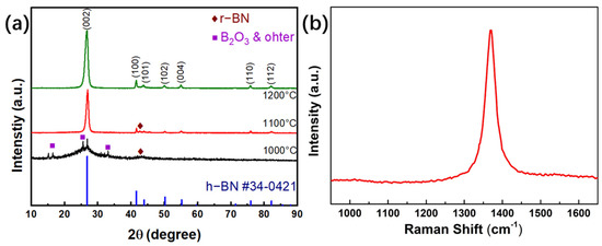 (a) XRD of the BN nanomaterial prepared at different temperature; (b) Raman spectrum of BN prepared at 1200 °C.