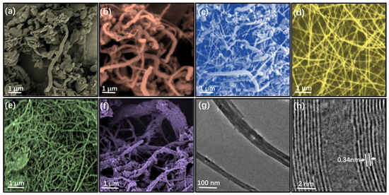 Figure 4 shows the SEM photos of the products when the molar content of iron nitrate (relative to boric acid) is 1%, 2%, 3%, 4%, 5%, and 6%. When the content of Fe is 1%, the products are mainly boron nitride nanoparticles, and there are some large nanotubes. With the increase of Fe content, the nanoparticles gradually disappear, and the products are mainly boron nitride nanotubes with large diameter and distorted shape (as shown in Figure 4b). When the amount of catalyst is further increased, nanotubes (4c) with smaller diameter and longer shape appear in the sample, and gradually become the main product. From the SEM, TEM, and HRTEM of the product when the proportion of Fe shown in Figure 4d,g,h is 4%, it can be found that the diameter and length of nanotubes are in the range of tens of nanometers and tens of microns, the tube wall is composed of multilayer boron nitride single wall, and the tube spacing is about 0.34 nm. When the content of Fe increases to 5%, the diameter of the nanotube becomes larger again and the shape changes from the long straight state to the twisted state, and continues to grow with the increase of the content of Fe. Finally, when the proportion of catalyst increases to 6%, various irregular forms appear.