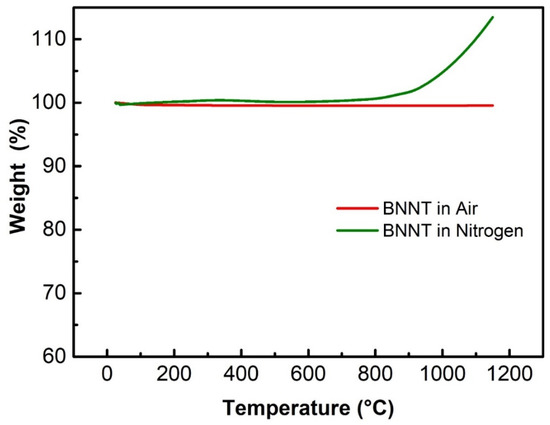 TG curves of the as-prepared BNNT in air and nitrogen.