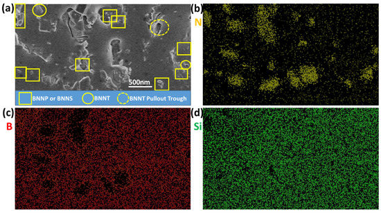SEM image (a) and eds mapping (b–d were N, B and Si, respectively) of cross-section of BN/PiG composite.
