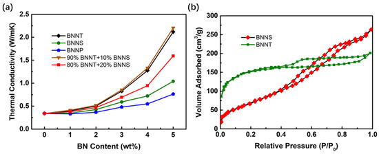 (a)Effect of BN nanomaterials with different morphology on the thermal conductivity of PiG; (b) Nitrogen adsorption–desorption isotherm of BNNT and BNNS.
