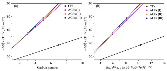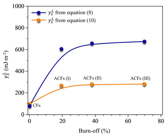 As previously reported by several researchers [24,25,26,27,33], it is now generally accepted that the of an ACF sample either determined from Gray’s method, Equation (8), or Park’s method, Equation (10), can be taken as a measure of its surface free energy. However, as Figure 2 shows that the values of calculated from Gray’s method are much greater than those determined using Park’s method. They are in the typical primary region (e.g., metal–metal bonds of mercury and tin are 475 and 526 mJ·m−2, respectively) [34]. Using our approach, they are ~300 mJ·m−2 and are consistent with the regime dominated by physical adsorption, which seems a more reasonable interpretation for highly porous and hydrophobic materials.