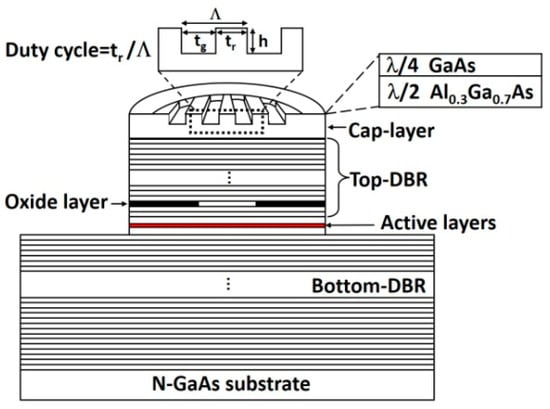 - Ostermann, J.M.; Debernardi, P.; Michalzik, R. Optimized Integrated Surface Grating Design for Polarization-Stable VCSELs. IEEE J. Quantum Electron. 2006, 42, 690–698. [Google Scholar] [CrossRef]