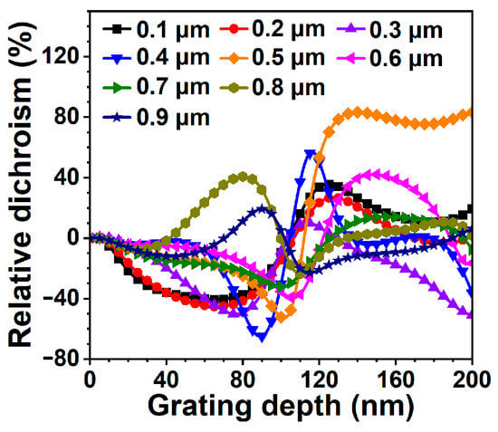Dependence of relative dichroism (RD) on grating depth with the grating period as a parameter. The duty cycle is 0.5.