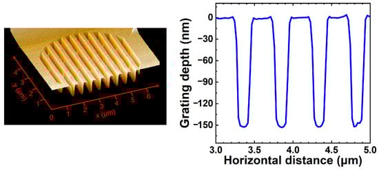 The epitaxial structure was grown on n-type (100) GaAs substrates by low-pressure metal-organic chemical vapor deposition (LP-MOCVD). The thickness of the cap layer composes of layers of λ/4-thick GaAs and λ/2-thick Al0.3Ga0.7As, meeting the condition of anti-phase []. The bottom and top DBR mirrors consist of 46.5 pairs Si-doped and 28 pairs C-doped Al0.3Ga0.7As/Al0.9Ga0.1As layers, respectively. A 20 nm-thick linearly composition-graded interface layer was inserted between the high and low Al-composition AlxGa1−xAs layers to reduce the series resistance. The active region with three 6.2 nm-thick Al0.073Ga0.927As quantum wells separated by 5 nm-thick Al0.39Ga0.61As barriers is sandwiched between two separate confinement layers. First, the surface gratings with a period of 500 nm, a depth of ~150 nm, and a duty cycle of 0.5 were fabricated using electron beam lithography (EBL) and inductively coupled plasma (ICP) etching techniques. Devices with surface grating periods of 200 nm, 700 nm, and 900 nm were also fabricated for comparison. To investigate how the size of the grating region affects the performances of VCSLEs, the diameters of the surface grating were varied from 2 μm to 5 μm. High-resolution positive photoresist, polymethyl methacrylate A2 resin with a molecular weight of 950 K, of approximately 130 nm was applied to the wafer by spinning coating for EBL. ICP etching was performed using Cl2 and BCl3 to form the surface grating at an etch rate of 10 nm/s. Atomic force microscopy (AFM) was used to analyze the profile of surface gratings. The AFM image of the fabricated surface grating is plotted in Figure 3. Then circle mesas with a diameter of 20 μm were etched to expose the layer of Al0.98Ga0.02As, which was then laterally oxidized to form an optical and electrical confinement aperture of ~4 μm by a selective wet oxidation process []. For planarization, the positive polyimide photoresist FB5410 from Fujifilm was coated on the P-side and cured for 1 h at 350 °C in a furnace. Subsequently, Ti/Pt/Au contact metals were deposited on the P-type topmost cap-layer by electron beam evaporation (EBE). Finally, the GaAs substrate was lapped to a thickness of ~150 μm, and the N-type contact metals of AuGe/Ni/Au were deposited using EBE, followed by rapid thermal annealing processing to form ohmic contacts. VCSELs without surface gratings were also fabricated as reference devices.