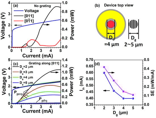 Figure 4a shows the room temperature (RT) polarization-resolved L-I-V characteristics curves of reference devices (without gratings). The polarization of the reference device switches at 1.5 mA and 2 mA. The phenomenon of polarization switching is often observed in conventional VCSELs due to the lack of a polarization control mechanism as mentioned earlier. In contrast, Figure 4c shows that the surface grating VCSELs produce a stable output polarization parallel to the grating ridge in the current range from threshold to thermal rollover for all the surface grating region diameters (Dg) at RT. Dg and Do are the diameters of the surface grating region and the oxide aperture, respectively, as illustrated in Figure 4b. From Figure 4c, it can be seen that the output power decreases from 1.1 mW to 0.23 mW as Dg increases from 2 μm to 5 μm at an injection current of 5 mA. The slope efficiency of the device decreases from 0.42 mW/mA to 0.11 mW/mA, and the threshold current decreases from 0.6 mA to 0.4 mA with the Dg increasing from 2 μm to 5 μm, as shown in Figure 4d. The grating period of 500 nm is larger than the critical value (234 nm for GaAs) of sub-wavelength grating, which introduces the diffraction loss [], consequently, the output power and slope efficiency are lower compared with the previous results. The as-grown reflectivity of the top DBR mirror calculated by the transfer matrix method [] is ~94%, lower than the normal device (99.4%) due to the addition of λ/4 thickness to the top layer, but it can be raised to more than 99% by etching the grating, depending on the grating period and depth. Therefore, when Dg < Do, the region of the emission window without grating (Do-Dg) has a lower reflectivity (higher diffraction loss) compared to the grating region, thus the threshold current decreases with the increasing Dg. When Dg ≥ Do, the oxide aperture is completely covered by the grating region, a constant high reflectivity is achieved, so the threshold current does not decrease further with Dg exceeding 4 μm as shown in Figure 4d, while the output power keeps decreasing because the diffraction loss increases with Dg, as shown in Figure 4c.