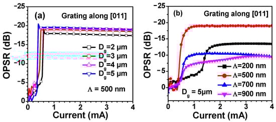 where and are the optical power of the polarization mode orthogonal and parallel to the grating ridges, respectively. The size of the surface grating region also affects the OPSR, as shown in Figure 5a. The OPSR slightly increases with the increasing Dg. When Dg = 5 μm, the OPSR of the device reaches 19.56 dB once the injection current is above the threshold current. OPSRs of the devices with different grating periods are shown in Figure 5b. It can be seen that the device with a 500 nm grating shows the best polarization control, which is consistent with the calculated results shown in Figure 2.