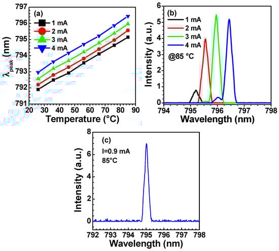 The lasing peak wavelength (λpeak) of a VCSEL changes with temperature and injection current. Figure 6a shows the temperature dependence of the peak wavelength at different injection currents. For an injection current of 1 mA, the emission wavelength is 791.8 nm at 26 °C, and its red-shift with increasing temperature reaches 795.14 nm at 85 °C. The fitted temperature coefficient is 0.055 nm/K and 0.058 nm/K for injection currents of 1 mA and 4 mA, respectively. This temperature coefficient difference indicates a higher wavelength red-shift rate at a higher injection current level. Figure 6b shows the emission spectra of a 500 nm-period surface grating VCSEL at 85 °C at different injection currents. It can be seen that the device remains a single transverse mode operation below 3 mA. The peak wavelength shifts at a rate of 0.38 nm/mA in the current range of 1 to 3 mA. Taking into account the temperature and injection current dependence of VCSEL lasing wavelength, the VCSEL emission wavelength at 85 °C can be tuned to 795 nm by adjusting the injection current to 0.9 mA, as shown in Figure 6c, which corresponds to the D1 line of the rubidium atomic clock [].