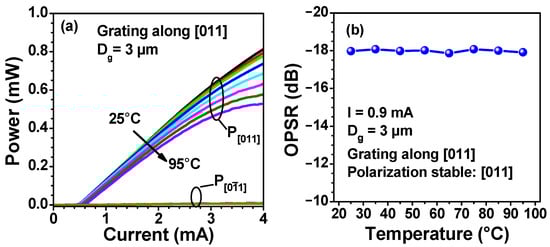 Figure 7a shows the light-current (L-I) curves of inverse surface grating VCSELs measured under different temperatures. The slope efficiency decreases from 0.28 mW/mA to 0.19 mW/mA and the threshold current increases from 0.5 mA to 0.64 mA as the temperature increases from 25 °C to 95 °C. The dominant polarization remains in [011] direction and the OPSR at an injection current of 1 mA is around 18 dB in the temperature range investigated, as shown in Figure 7b, indicating a stable polarization even at a high temperature.