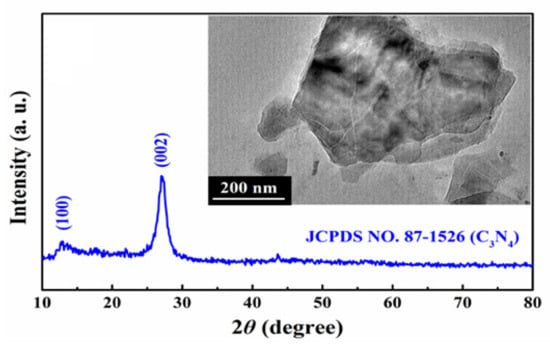 Furthermore, the morphologies and sizes of the 2D organic g-C3N4 nanosheets characterized by TEM are demonstrated in the picture embedded in Figure 2. The synthesized 2D g-C3N4 organic catalyst nanomaterials are sheet particles, while the layer morphology of the 2D organic g-C3N4 nanosheet catalyst is the key to affecting the pyroelectric performance [17,22]. It can be seen from the TEM result in the inset of Figure 2 that the 2D organic g-C3N4 nanosheet catalyst is very thin. This is conducive to more exposure of reactive sites, which is beneficial to the separation and transport of these pyroelectrically induced positive and negative electric charges, improving the dye decolorization efficiency of the pyro-catalytic reaction.