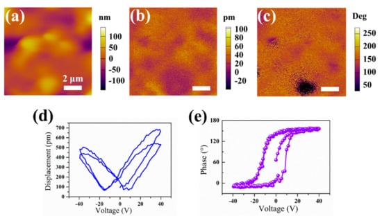 Ferroelectricity is applicable to materials with spontaneous electrical polarization that can be reversed by the application of an external suitable electric field. The neat electric dipolar alignment can be broken under the external stress or thermal excitation, which can change the polarization strength and break the charge balance on the ferroelectric material’s surface, resulting in the occurrence of the piezoelectric effect or the pyroelectric effect. Therefore, all ferroelectric materials are pyroelectric and all pyroelectric materials are piezoelectric [29,30,31,32]. The ferroelectric/piezoelectric response of the 2D organic g-C3N4 nanosheet catalyst was characterized through the PFM. The topography shows the 2D organic g-C3N4 nanosheet catalyst has a flat and smooth surface (Figure 3a). The corresponding PFM amplitude and phase images show a clear contrast, which suggests that the 2D organic g-C3N4 presents ferroelectric domains as shown in Figure 3b,c. Well-defined butterfly loops of the PFM amplitude signals corroborate the good piezoelectric response of the 2D organic g-C3N4 nanosheet catalyst materials (Figure 3d). The phase angle of the g-C3N4 shows obvious and typical ferroelectric hysteresis and a 170° change under direct current bias field voltages ranging from −40 V to +40 V, revealing the ferroelectric polarization switching process of the 2D organic g-C3N4 nanosheet catalysts (Figure 3e). Thus, the pyroelectric performance of the 2D organic g-C3N4 nanosheet catalyst materials can be expected.
