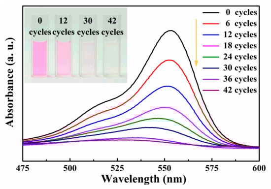 To test g-C3N4 nanosheets’ ability to generate electric potential under temperature changes, a pyro-catalytic experiment was conducted to degrade RhB dye. The experiment involved exposing the g-C3N4 nanosheets and the RhB dye solution to a cold–hot alternation cycle and measuring the decolorization rate of the dye. The color change indicates the degree of decolorization and the removal of organic pollutants from the dye solution. By observing the color change of RhB dye, the effectiveness of the organic 2D g-C3N4 nanosheets in catalyzing the degradation of the dye under temperature changes can be easily perceived. Figure 4 displays the changes in the absorption spectra of RhB after being subjected to various numbers of cold–hot thermal cycles in the presence of the 2D organic g-C3N4 nanosheet catalyst. It can be seen that the characteristic absorption spectrum of RhB dye is about 554 nm, corresponding to the π-π* transition of the conjugated system in RhB molecules [33]. As the number of cold–hot thermal cycles increase, the absorption intensity of RhB dye solution decreases sharply. The absorption spectra reflect the concentration of RhB molecules in the solution. The decrease in the absorption peaks indicates the decolorization of RhB by the pyro-catalytic action of g-C3N4 nanosheets. As shown in the inset of Figure 4, we can visually see the decolorization progress through the color change of the RHB solution during pyro-catalysis. Apparently, after 42 cold–hot thermal cycles, the color of RhB dye solution gradually fades from the initial pink to colorless.