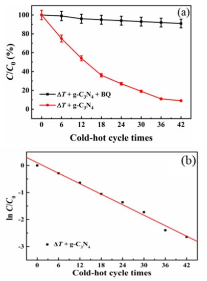 In order to study the chemical reaction of •O2−, BQ was used as •O2− trapping agent in the pyro-catalytic RhB decoloration in the presence of the organic 2D g-C3N4 nanosheet catalysts. The pyro-catalytic decolorization of RhB dye was repeated [30,31]. The decoloration efficiency curve C/C0 vs. the cold–hot cycle times of RhB dye can be seen in Figure 5a. The addition of BQ (the quencher of •O2−) mediated by the 2D organic g-C3N4 pyro-catalyst material significantly inhibits the decoloration of RhB dye, indicating that active •O2− is the primary reactive species in the pyro-catalysis process [36,37].