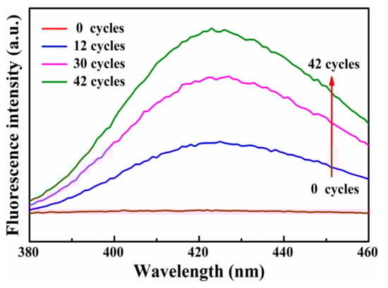 Furthermore, •OH was also observed as middle products of pyro-catalytic RhB dye decoloration in the presence of the 2D organic g-C3N4 nanosheet catalysts. In the experiment, the terephthalic acid was used as the photoluminescent •OH trapping agent. The •OH reacts with the terephthalic acid to form a highly fluorescent product, 2-hydroxyterephthalic acid, which has a characteristic fluorescence peak at the wavelength of ~425 nm [38,39]. The significant fluorescent signals associated with 2-hydroxyterephthalic acid are shown in Figure 6. The 2D organic g-C3N4 nanosheets produce positive and negative electric charges after experiencing different thermal cold–hot cycles to generate the active species of hydroxyl radicals. The hydroxyl radicals combined with terephthalic acid to produce 2-hydroxyl terephthalic acid, which shows an obvious fluorescence signal. As shown in Figure 6, the amount of •OH produced during the pyro-catalytic process is proportional to the strength of the 2-hydroxyterephthalate PL peak [38,39,40], which indicates that the •OH are one of the middle active species in the process of pyro-catalysis of the 2D organic g-C3N4 nanosheet catalysts.