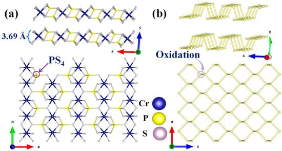 Schematic diagrams of crystal structures of layered (a) CrPS4 and (b) BP. (The arrows represent the three coordinate axes of the crystallographic coordinate system.)