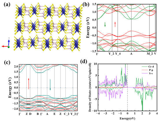 (a) Structure of CrPS4 (The arrows represent the three coordinate axes of the crystallographic coordinate system); (b,c) electronic band structures of the bulk and monolayer CrPS4 materials calculated by the HSE06 function (The red arrow denotes spin-up bands, while the green arrow represents spin-down bands in the energy band structure.); (d) DOS of the bulk CrPS4.
