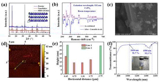 Using the LPE method, few-layer CrPS4 nanoflakes were exfoliated simply and effectively. Subsequently, we demonstrated the powder X-ray diffraction (XRD) patterns of CrPS4 and its samples after exfoliation treatment by XRD spectroscopy, as illustrated in Figure 3a. It can be seen that the positions of the diffraction peaks on the two patterns were in almost perfect agreement with a standard PDF card of CrPS4 (PDF #30-0411), indicating the integrity of the structure after exfoliated CrPS4 nanoflakes were obtained. In addition, the diffraction pattern from the CrPS4 sample was analyzed using X’pert Highscore Plus 3.0 []. The characterization of the diffraction pattern occurred in the range of 2ϴ = 10–70°, as shown in Figure S1. The diffraction pattern from the sample matched well with the diffraction pattern from the previous report. The reference code of CrPS4 is 00-033-0404 []. The vibrational modes of the CrPS4 were verified by the Raman spectrum and detected in the range 200–700 cm−1 (excitation wavelength: 532 nm, inVia, Renishaw, Wotton-under-Edge, UK) at room temperature. As shown in Figure 3b, about 13 vibration peaks were found in the Raman spectrum; this was in agreement with previously reported results [], and further confirmed the rationality of the structure of the CrPS4. The surface morphology of the samples as exfoliated was then analyzed via scanning electron microscope (SEM, JSM-5910LV, JEOL, Tokyo, Japan). As depicted in Figure 3c, the CrPS4 nanoflakes exhibited an obvious layered structure, indicating that the nanoflakes were successfully fabricated based on the LPE method. The morphology of the CrPS4 nanoflakes was also tested using an atomic force microscope (AFM, MFP-3D Infinity, Asylum Research, Oxford, UK), which can observe the lateral size of nanoflakes. Figure 3d,e show CrPS4 nanoflakes with an average thickness of ~25 nm. The linear optical transmission spectrum of exfoliated CrPS4 was also detected using a UV-vis-NIR spectrophotometer (LAMBDA, Perkin Elmer Inc., Waltham, MA, USA). We found that, at wavelengths of 1030 and 1530 nm, the transmittances were approximately 91.7% and 93.3%, respectively (Figure 3f). BP has attracted tremendous interest because of its natural layer-dependent direct-band-gap energy, but layered BP is unstable and degrades rapidly in ambient conditions within hours. Calculated results indicated that CrPS4 is also a direct-band-gap semiconductor, and this made us keen to discover if it was stable in ambient conditions for long time periods. Firstly, taken together, the powder XRD and Raman spectroscopy studies clearly demonstrated that the CrPS4 structure remained stable after months in ambient conditions. As shown in Figure S1a, the intensity and peak position of CrPS4, both as exfoliated and after ~2 months in air, remained essentially unchanged. The intensity and peak position of the Raman modes of CrPS4 also remained essentially unchanged for ~2 months, indicating the air-stability of CrPS4 (shown in Figure 3b). The CrPS4 nanoflakes were then analyzed via energy-dispersive X-ray spectroscopy (EDS, Oxford Instruments, Oxford, UK). As depicted in Figure S1c,d, an average Cr/P/S molar ratio of 1.0:1.0:4.0 was recorded for CrPS4 nanoflakes as exfoliated and again after ~2 months in air, further confirming the air-stability of the samples. To more intuitively demonstrate this stability after exposure to air for about 2 months, the surface morphology of the sample was analyzed via SEM. As can be seen in Figure S1c, the CrPS4 nanoflakes continued to exhibit an obvious layered structure.