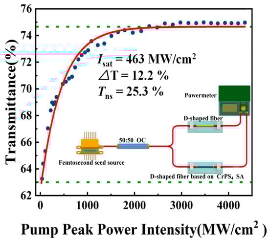 The obtained few-layer CrPS4 nanoflakes were then dripped onto the D-shaped fiber to form an SA device. To investigate the nonlinear optical properties of the CrPS4-SA, a dual-channel balanced detection measurement system based on an erbium-doped fiber laser (1550 nm, 100 fs, 8.05 MHz) was employed, as shown in Figure 4 inset. Equation (1) only considers the case of single-photon absorption, and the nonlinear saturated absorption curve of CrPS4-SA was obtained after fitting [,].