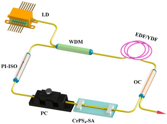 Next, to validate the excellent potential of the layered CrPS4 for ultrafast laser applications, we constructed 1.0 μm and 1.5 μm all-fiber laser cavities using Er-doped or Yb-doped fibers. The structural diagram of the optical fiber laser structure is shown in Figure 5. The laser cavity consisted of a section of Er-doped or Yb-doped fiber, a laser diode (980 nm Pump Laser, Hanyu, Shanghai, China), a wavelength division multiplexer (WDM, Mingchuang, Shenzhen, China), an optical coupler (OC, Mingchuang, Shenzhen, China), a polarization-independent optical isolator (ISO, Mingchuang, Shenzhen, China), a polarization controller (PC, General Photonics, Losa Angeles, US), and a D-shaped fiber based on CrPS4-SA. ISO and PC were used to ensure the unidirectional propagation of light and to adjust its polarization state, respectively. The evanescent field length of the D-shaped fiber optic bare leak was 10 mm, and the distance between the surface and the core was 1 μm. The Er-doped fiber laser cavity length was 21.96 m, including 4 m EDF (Nufern EDFC-980-HP, Hanyu, Shanghai, China) and 17.96 m single-mode fiber (SMF, Hanyu, Shanghai, China), with dispersion parameters at 1530 nm of −12.2 ps/(km·nm) and 18 ps/(km·nm), respectively. The net dispersion was estimated as −0.39 ps2. Similarly, the cavity length of Yb-doped laser consisted of 1 m YDF (Nufern SM-YSF-HI-6/125, Hanyu, Shanghai, China) and 15.56 m single-mode fiber (HI1060), and the net dispersion of the cavity was estimated at 0.35 ps2. The pulse performance of the laser output was determined by a power meter, a spectrum analyzer (AQ6370C, Yokogawa, Tokyo, Japan), a photodetector (DET08CFC/M 5 GHz, Thorlabs, Newton, MA, USA), a hybrid oscilloscope (DP04104B 1 GHz/s, Tektronix, OR, USA), and autocorrelator monitoring (PulseCheck, APE, Berlin, Germany). The temperature and humidity of the ultra-clean laboratory were 16.8 °C and 58%, respectively.