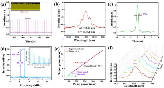 Importantly, we performed pre-experiments to demonstrate that, in the absence of SA, no mode-locking occurred in the laser cavity, regardless of PC modulation or pump power. By such means, we confirmed the authenticity of the experiment. After SA was applied to the laser cavity, we adjusted the PC while continuously increasing the pump power, and observed the output waveform of the oscilloscope. We achieved continuous-wave mode-locking (CWML) when the pump power was higher than 170 wm. When the pump power was increased to 300 mW, the output power was 10.64 mW, and pulse energy and peak power were 1.174 nJ and 3.94 W, respectively. The mode-locking sequence diagram is presented in Figure 6a, which shows a 110.4 ns time interval between adjacent pulses, which corresponds well to the pulse repetition rate of 9.05 MHz. The inset in Figure 6a shows the amplitude intensity plot of the mode-locked pulse sequence; this indicates that the mode-locked sequence existed stably for a long time. The spectrum with a central wavelength of 1036.1 nm had a 3 dB spectral width of 0.84 nm, as shown in Figure 6b. The autocorrelation trace corresponding to the measured pulse at this time is shown in Figure 6c. It can be seen that the pulse width is about 298 ps, and the time-bandwidth product (TBP) is 69.9, indicating that the pulse has a serious chirp. In Figure 6d, a signal-to-noise ratio (SNR) measurement of approximately 55.3 dB can be observed with a higher signal peak at a laser cavity repetition rate of 9.05 MHz. The relationship between the mode-locked output power and pump power is shown in Figure 6e. When the pump power was 130 mW, the laser cavity output a continuous wave (CW). When the pump power was increased to 170 mW, the output was CWML, and the measured slope efficiency was about 4.9%. Subsequently, we measured the output spectrum of the laser cavity over a longer timescale, at time intervals of 1 h, for a total of 6 h. As shown in Figure 6f, the long-term spectrum was quite stable, indicating that a ytterbium-doped laser has the potential of highly stable operation.