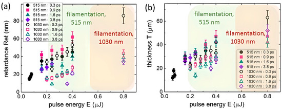 Retardance (a) and birefringent microstructure thickness (b) values versus pulse energy for different pulse widths (symbols of different shapes and colors) at 515 nm (solid symbols) and 1030 nm (open symbols) wavelengths. The green and reddish highlighted regions indicate the filamentation pulse energy ranges at these wavelengths, respectively, based on experimental results in [20].