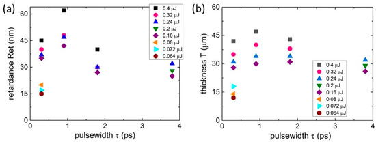 In contrast, at the 1030 nm laser inscription wavelength the maximal Ret magnitudes at each pulse energy were achieved at the minimal pulsewidth and the maximal pulse energy (Figure 3a). In the same line, the corresponding T-magnitudes decreased versus τ at each pulse energy (Figure 3b) but were weaker than the corresponding Ret values. Simultaneously, T(τ) curves at the wavelength went almost together irrespective of the pulse energies until the maximal energy point of 0.8 μJ. This indicates that not the thickness, but the enhanced local energy deposition, i.e., the fluorite photoionization process, at the maximal pulse energy produced the maximal birefringence.