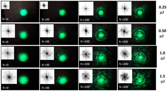 Specifically, in Figure 6, at the minimal near-threshold pulse energy of 0.25 μJ, one can see the exposure-dependent transformation of the initial diverging Gaussian beam into the circular patterns (N = 100) and separate peaks (N = 200). The N-dependent emerging circular patterns could indicate the microscale damage cavity, while the spectral peaks could characterize micron-scale radial periodic structures in the focal region or the emerging filament. In contrast, at higher above-threshold pulse energies, representing the filamentation regime (see the (multi)ring FFT patterns, starting at N = 0 in Figure 6), more complex multi-ring patterns appear in the diffraction images, giving rise to the more sophisticated—multi-ring or multi-peak—spectral patterns, which are yet to be understood in terms of laser pulse self-action during the inscription process [30,31]. Their analysis is also ongoing in the optical spectral (wavelength) domain in order to resolve non-linear optical, plasma and material effects.