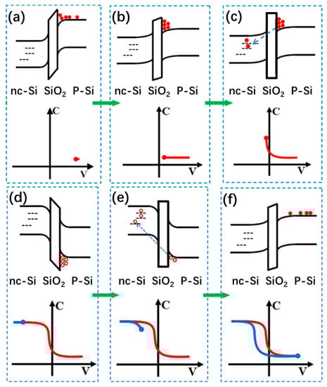 Figure 3 shows the schematic diagram of the counterclockwise C–V hysteresis formation from the SiNx/nc-Si(a-Si)/SiO2 floating-gate MOS structure. As displayed in Figure 3a,b, the free electrons accumulated on the surface of the Si substrate under a positive bias. With the positive bias reaching a critical value, the electrons can tunnel through the SiO2 layer into the nc-Si layer, as shown in Figure 3c. The transfer of electrons contributes to a positive movement of the flat band voltage. The control SiNx layer can prevent electrons moving from the nc-Si to the upper electrode just like a blockade. As a result, the electrons can be stored in the nc-Si quantum dots in the nc-Si layer. Similarly, when the gate voltage changes from positive to negative, the free holes tunnel from the substrate into the nc-Si layer, causing the flat band voltage to move negatively, as shown in Figure 3d–f. Therefore, a counterclockwise C–V hysteresis window is formed.