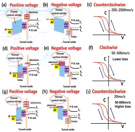 The energy band gap model of the SiNx/nc-Si/SiO2 floating-gate MOS structure with thicker SiNx control layer under (a) positive and (b) negative voltages. (c) The counterclockwise hysteresis memory window of the SiNx/nc-Si/SiO2 floating-gate MOS structure with step size from 250 to 2500 mv/s. The energy band gap model of the SiNx/nc-Si(a-Si)/SiO2 floating-gate MOS structure with the thinner control SiNx layer under (d) positive and (e) negative voltages. (f) The clockwise C–V hysteresis memory window of the SiNx/nc-Si/SiO2 floating-gate MOS structure with the step size from 50 to 500 mv/s. The energy band gap model of the SiNx/nc-Si(a-Si)/SiO2 floating-gate MOS structure with the thinner SiNx control layer under (g) positive and (h) negative voltages. (i) The counterclockwise C–V hysteresis memory window of the SiNx/nc-Si/SiO2 floating-gate MOS structure with the step size of 20 mv/s. The hollow circles and solid circles represent the holes and electrons, respectively.