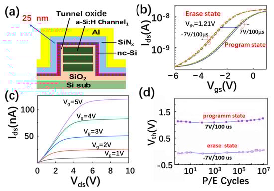 The erasing and programming performance of the 3D NAND nc-Si floating-gate memory unit, based on a three layered a-Si:H channel with a thicker control SiNx of 25 nm, is shown in Figure 6a,b. As displayed in Figure 6c, the corresponding output current is increased with the positive gate voltage changing from 1 to 5 V, displaying the N-type characteristic of the a-Si channel. A stable memory window of 1.21 V can be obtained under the programming and erasing voltages of +7 V and −7 V. The programming and erasing speed reaches 100 µs. It is worth noting that the stable memory window of 1.21 V can be maintained after 107 P/E cycles, as shown in Figure 6d. The novel performance of the 3D NAND nc-Si floating-gate memory unit is determined by the design of the nc-Si floating gate with a novel SiNx control layer.
