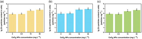Uptake of CeO2 NPs by E. coli cells after exposure. Particle content CeO2 NPs internalized in E. coli cells in System 1 (a), System 2 (b) and System 3 (c). Lowercase letters represent the statistical significance among different concentrations of CeO2 NPs.