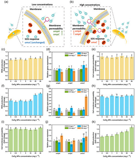 Effect of CeO2 NPs on the ROS generation and cell membrane permeability. Illustrative diagrams of ROS, membrane permeability, SOS response, and corresponding gene expressions regulated by CeO2 NPs exposure (a,b). Fold changes of ROS content regulated by CeO2 NPs in System 1 (c). Relative gene expression in System 1 (d). Fold changes of cell membrane permeability regulated by CeO2 NPs in System 1 (e). Fold changes of ROS content regulated by CeO2 NPs in System 2 (f). Relative gene expression in System 2 (g). Fold changes of cell membrane permeability regulated by CeO2 NPs in System 2 (h). Fold changes of cell membrane permeability induced by CeO2 NPs in System 3 (i). Relative gene expression in System 3 (j). Fold changes of ROS content induced by CeO2 NPs in System 3 (k). Lowercase letters represent the statistical significance among different concentrations of CeO2 NPs.