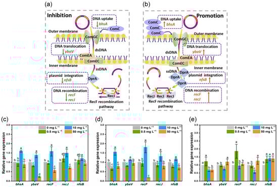 The retraction of pseudopilus facilitates the contact of double-stranded DNA (dsDNA) with protein ComEA, after which one strand of DNA is degraded by EndA and the remaining single-stranded DNA (ssDNA) is translocated into cytoplasm through the ComEC transmembrane channel [50,54]. The internalized ssDNA is bound by ssDNA-binding protein DprA (encoded by gene nfsB), which is essential for the formation of duplex circular plasmid and homologous recombination of incoming ssDNA [54,55,56]. The expression of nfsB was up-regulated in the presence of 10 mg L−1 CeO2 NPs for all three systems (Figure 5c–e), while CeO2 NPs at 0.5 and 50 mg L−1 led to an opposite regulation of nfsB expression in System 2 (down-regulation by 0.8- and 0.7-fold, respectively) and System 3 (up-regulation by 1.3- and 1.4-fold, respectively) (Figure 5d,e). Mutation of nfsB in Helicobacter pylori inhibited the uptake of plasmids, significantly reducing the transformation frequency (over 90%); additionally, Deinococcus radiodurans (D. radiodurans) exhibited a 21-fold reduction of plasmid transformation frequency in the absence of the DprA protein [57,58]. Thus, although the expression of ybaV remained unchanged in System 2 (50 mg L−1 CeO2 NPs), the down-regulation of nfsB and bhsA may contribute to the decreased transformation (Figure 5d). DNA replication is known to be closely related to the recF pathway of recombination [59]. RecJ, a member of DHH family of proteins, is the only 5′ → 3′ exonuclease involved in the RecF recombination pathway [60]. The frequency of plasmid recombination decreased with the mutation of recJ in E. coli strains [61]. The expressions of recF and recJ were up-regulated in E. coli cells exposed to 10 mg L−1 CeO2 NPs (System 1 and 2) (Figure 5c,d), whereas significant down-regulation (0.6- and 0.7-fold) was observed in cells exposed to 50 mg L−1 CeO2 NPs in System 1 (Figure 5c). Thus, pre-exposure of competent cells with CeO2 NPs (0.5 or 50 mg L−1) in both System 1 and 2 inhibited the DNA uptake and integration (Figure 5a,b), with System 2 being more sensitive to the CeO2 NPs. Compared to the plasmids, the positively charged CeO2 NPs were more likely to be attracted to the cell membrane, leading to an increased internalization of NPs and up-regulation of functional genes. In System 3, CeO2 NPs induced the expression of genes involved in DNA recombination regardless of different concentrations (Figure 5e). However, only 10 mg L−1 CeO2 NPs inhibited the transformation while 0.5 and 50 mg L−1 did not show any impact. Similarly, CeO2 NPs at 10 mg L−1 exhibited a high binding affinity to DNA and a strong inhibitory effect on the gene expression for DNA replication [62]. In addition, the double mutation of dprA and recF completely abolished DNA transformation in D. radiodurans [58]. On this basis, we speculated that the simultaneous down-regulation of recF and nfsB in System 2 (50 mg L−1) might have contributed to the significant reduction in transformation. CeO2 NPs (particularly 10 mg L−1) may inhibit the transformation of eARGs by suppressing the replication of DNA. However, for System 1 and 2, a high concentration of CeO2 NPs (50 mg L−1) was required to generate same inhibiting effect on DNA replication, thereby reducing the transformation frequency.