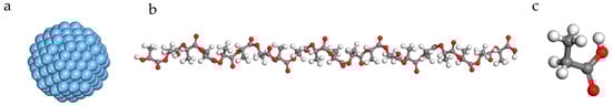 In the current work, molecular dynamics simulations are conducted using LAMMPS [] which is an efficient tool for simulating large-scale atomistic systems and enables spatial decomposition of the domain on parallel processors. Rendering and a part of post-processing are performed through the Open Visualization Tool (OVITO, version 3.7.9, OVITO GmbH, Germany) developed by Stukowski et al. [] while the initial structures are created in Materials Studio software []. Nanofibres are composed of PLA which is a biodegradable polymer obtained from renewable sources and agricultural products with very low toxicity []. The molecular formula of PLA is [], which is shown in Figure 1. Silver nanoparticles (Ag-NP) with a diameter of 1.8 nm are used as the doping agent of PLA nanofibre, as shown in Figure 2a. Polymer nanofibres (PNFs) with a diameter of 5.4 nm are constructed from 90 numbers of 20-monomer polymer chains (Figure 2b), where each monomer contains three carbon atoms, four hydrogen atoms, and two oxygen atoms (Figure 2c).