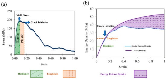 In addition to the stress curve, the strain energy density () is tracked during deformation (Figure 5b). The strain energy density at the onset of yield and fracture is used to calculate the moduli of resilience and toughness, which measure the amount of strain energy density that a material can absorb before yielding or fracture.