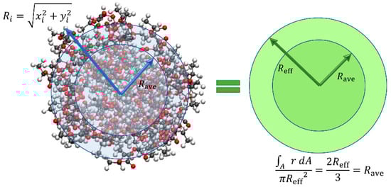 In previous works on MD simulation of nanofibres, usually, the Gibbs dividing surface (GDS) has been employed to calculate the equivalent radius [,,,]. In a simplified expression, GDS for nanofibres determines the radius of a homogenous fibre with a density equal to that of the fibre core and with the same integral mass as the original fibre. However, in this work, we use a different approach which results in less noise during uniaxial deformation as compared to GDS. However, in this work, we employ a new technique that results in less noise during uniaxial deformation as compared to GDS. At each time step, the average radial distance () of all atoms from the centroid is set equal to the mean radius () of an equivalent solid circle. The radius of this equivalent cylinder is supposed as the effective radius () of nanofibres considering (as illustrated in Figure 6).