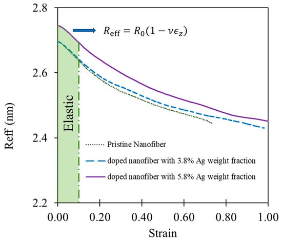 The increase in Young’s modulus and yield stress is in line with experimental observations of doped nanofibrous networks [,,,,]. Furthermore, as illustrated in Figure 7, using the radial deformation in the elastic regime, Poisson’s ratio (ν) is determined for the three nanofibres and provided in Table 1.
