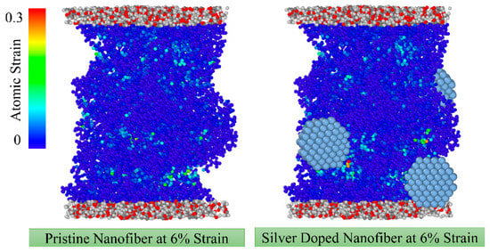 In Figure 9, the distribution of atomic strain is compared for pristine and silver-doped nanofibres at 5% strain where nanofibres are in the linear elastic phase according to the stress curve in Figure 5a. As demonstrated in Figure 9, nanoparticles have little influence on the atomic strain distribution in the elastic phase, even though some localised strain arises in the vicinity of nanoparticles. According to the elastic and plastic parameters in Table 1, nanoparticles moderately enhance the brittleness of nanofibres, resulting in a greater Young’s modulus and yield stress, whereas yielding occurs slightly earlier in the doped nanofibres. In addition, the moduli of resilience and toughness have reduced in doped nanofibres, also indicating increased brittleness. These moduli represent the amount of strain energy density that a material can accommodate before yield or fracture, respectively.