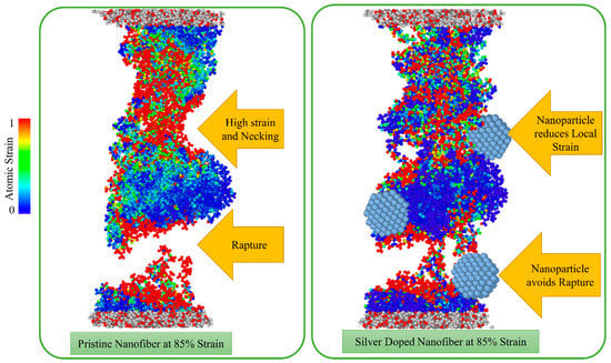 To study the effect of the weight fraction of the nanoparticles, Figure 11 compares the distribution of atomic strain in pristine and doped nanofibres with 3.9% and 5.8% weight fractions of Ag NP. Although according to Table 1, the elastic properties of nanofibres doped with 3.9% of Ag NP are slightly higher than those doped with 5.8%, which may be due to the localised strain near the added nanoparticle, the improvement in fracture resistance is much more pronounced in the case of 5.8%. To facilitate discussion, the nanoparticles are numbered in Figure 11. As can be seen in this figure, the presence of NP numbered 3 at 5.8% weight fraction is quite effective in preventing polymer chain detachment and increasing fracture strength; however, it should be noted that the results also depend on the position at which the nanoparticles are launched. It can be seen from Figure 11 that the nanoparticle numbered 2 in the middle of the doped nanofibre did not play a favourable role as it attracted the polymer chains on one side of the initiated crack.