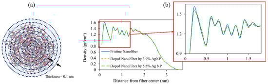 (a) The schematic of nanofibre cross-sections divided into concentric cylindrical shells of 0.1 nm thickness. (b) Distribution of radial mass density of pristine and doped nanofibres.