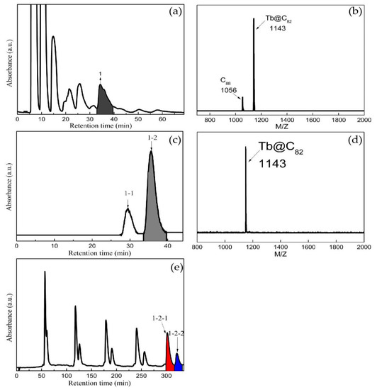 Previously, pure endohedral metallofullerenes have been isolated by preparative high-performance liquid separation chromatography (HPLC) without exception, in which various columns are applied in a multi-stage procedure. In this work, Tb@C82 (I, II) isomers were isolated by the following process. The toluene solution of fullerenes and metallofullerenes was filtered with a 0.2 μm PTFE membrane, then subjected to three-stage HPLC isolation. Firstly, a 5PYE column was chosen to separate the mixture of fullerenes and metallofullerenes. The 5PYE was packed with planar aromatic 2-(1-pyrene)ethyl-group-modified silica gel, which is appropriate to separate fullerenes and metallofullerenes in line with their molecular weights. As shown in Figure 1a,b, the eluate collected at 32–39.5 min was mainly composed of C88 and Tb@C82 (I, II). Secondly, a Buckyprep-M column was adopted to separate C88 from Tb@C82 (I, II). The Buckyprep-M column was packed with phenothiazine-bonded silica gel, which plays a crucial role in isolating metallofullerenes from fullerenes. It can be seen in Figure 1c,d that the eluate collected at 33.5–40 min was mainly composed of Tb@C82 (I, II). Finally, the Tb@C82 (I, II) isomers were isolated on a Buckyprep column by cyclic HPLC. The Buckyprep column was packed with 3-(1-pyrene)propyl-bonded silica gel, which has good ability to isolate metallofullerene isomers. As displayed in Figure 1e, Tb@C82 (I) and Tb@C82 (II) were successfully isolated after five cycles.