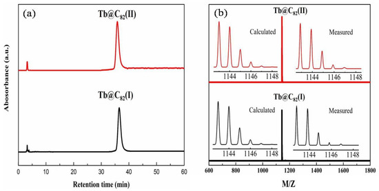 The isolation of Tb@C82 (I, II) isomers was conducted on a recycling preparative high-performance liquid chromatograph (HPLC, LC-9104, Analytical Co., Ltd., Kyoto, Japan) using toluene as the eluent. Three columns, including 5PYE (25 × 250 mm, NacalaiTesque, Kyoto, Japan), Buckyprep-M (25 × 250 mm, NacalaiTesque, Kyoto, Japan), and Buckyprep (25 × 250 mm, NacalaiTesque, Kyoto, Japan), were applied in a three-stage separation procedure. The purity of isolated Tb@C82 (I, II) isomers was checked by analytical HPLC (L-2000, Hitachi, Tokyo, Japan) and a matrix-assisted laser desorption/ionization time-of-flight (MALDI-TOF) mass spectrometer (Biflex III, Bruker, Bremen, Germany). The analytical HPLC was carried out on a Buckyprep column (4.6 × 250 mm, NacalaiTesque, Kyoto, Japan), and the matrix for MALDI mass spectrometry was 1,1,4,4-tetraphenyl-1,3-butadiene (TPB, Aladdin, Shanghai, China).