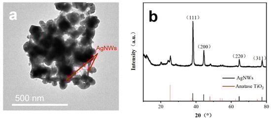 Figure 4b, it can be observed that four clear diffraction peaks of AgNWs appear at 38.1°, 44.2°, 64.4°, and 77.4°, which compare to the results with standard PDF cards, respectively, corresponding to the (111), (200), (220), and (311) face-centered cubic phase silver crystal plane diffraction [