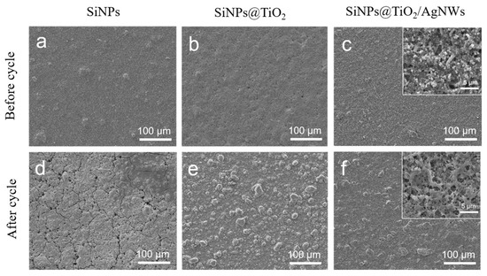 Figure 7d that there are obvious cracks on the surface of the electrode sheet, which is caused by the volume expansion and the situation is serious enough to cause particle shedding. The surface of the SiNPs@TiO