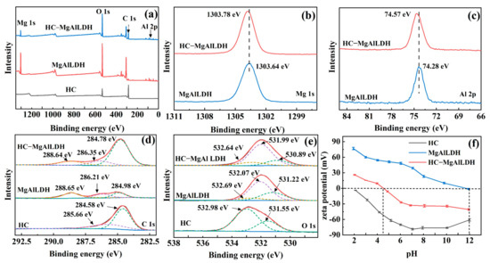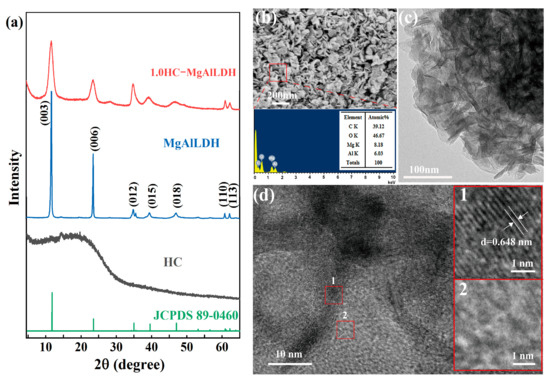 3.1. Characterization of HC–MgAlLDH Nanocomposites