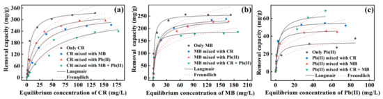 3.3. Insight into the Removal Mechanisms of CR, MB and Pb(II)