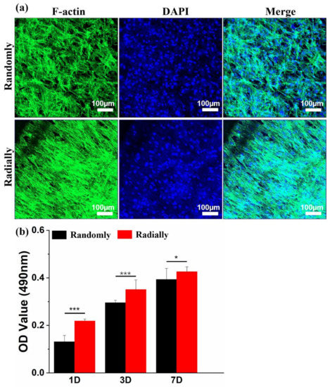 (a) Fluorescent images of F-actin (green) and nuclei (blue) staining on day 7 after HAMSCs were seeded and cultured on PHBV nanofiber scaffolds with both randomly and radially oriented patterns. (b) MTT results after HAMSCs were seeded and cultured on two different samples over 7 days (n = 5; * p < 0.05, *** p < 0.001).