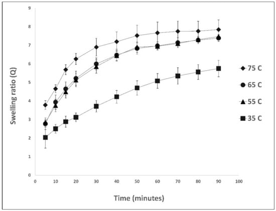 The magnetic nanocomposites were characterized through a kinetic swelling study, as summarized in Figure 2. By mimicking the RhB removal experiment with varying AMF strength, a swelling study was conducted in a water bath using 3% MNP in nanocomposite at the same stable temperatures of the varying AMF strength. When subjected to greater temperatures, magnetic nanocomposites swell significantly more. This is attributed to the fact that an increase in temperature causes the dissociation of hydrogen bonds in an intra-polymer complex, resulting in an increase in the number of hydrophilic sites capable of interacting with water molecules and a decrease in the crosslinking density of the hydrogel. This extends the distance between the polymeric chains, thereby facilitating the diffusion of water into the nanocomposites [,]. The swelling continues until equilibrium is reached across all temperature exposures.